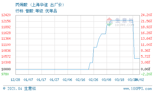 4月1日,上海華誼丙烯酸最新報(bào)價(jià)(華東送到)在10500元/噸,較上一交易日相比持平,實(shí)際成交價(jià)以協(xié)商為主。