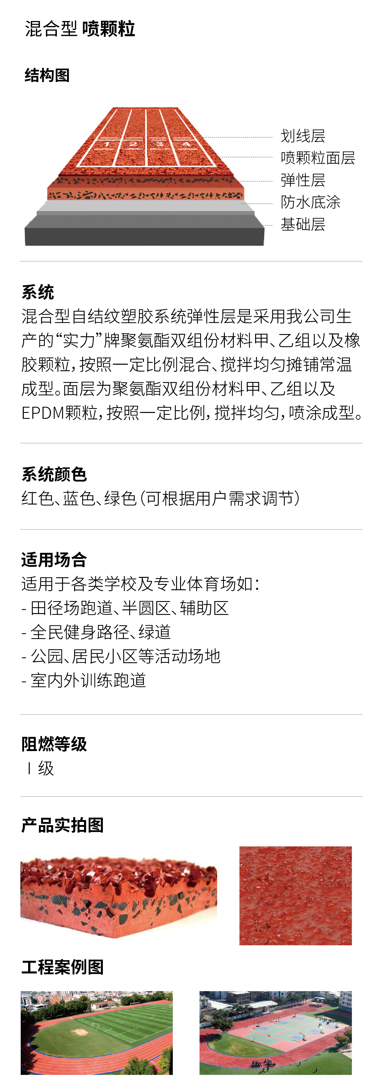 產(chǎn)品簡介:混合型自結(jié)紋塑膠系統(tǒng)彈性層是采用我公司生產(chǎn)的“實力”牌聚氨酯雙組份材料甲、乙組以及橡膠顆粒,按照一定比例混合、攪拌均勻攤鋪常溫成型。...