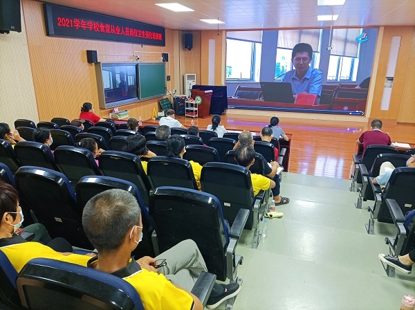 為了預(yù)防和及時(shí)處置食源性疾病等突發(fā)事件的發(fā)生,保護(hù)廣大師生的生命安全,做好中小學(xué)生營(yíng)養(yǎng)配餐指導(dǎo)工作,改善學(xué)生營(yíng)養(yǎng),增強(qiáng)學(xué)生體質(zhì),9月9日下午,中山市舉辦2021學(xué)年學(xué)校食堂從業(yè)人員崗位衛(wèi)生強(qiáng)化培訓(xùn)班。古鎮(zhèn)鎮(zhèn)教育與體育事務(wù)中心衛(wèi)生專干李維鋒、各中小學(xué)分管食堂的行政、食堂管理人員和從業(yè)人員和學(xué)生集體配送餐企業(yè)全體員工在曹二小學(xué)報(bào)告廳收看了培訓(xùn)班直播視頻。
