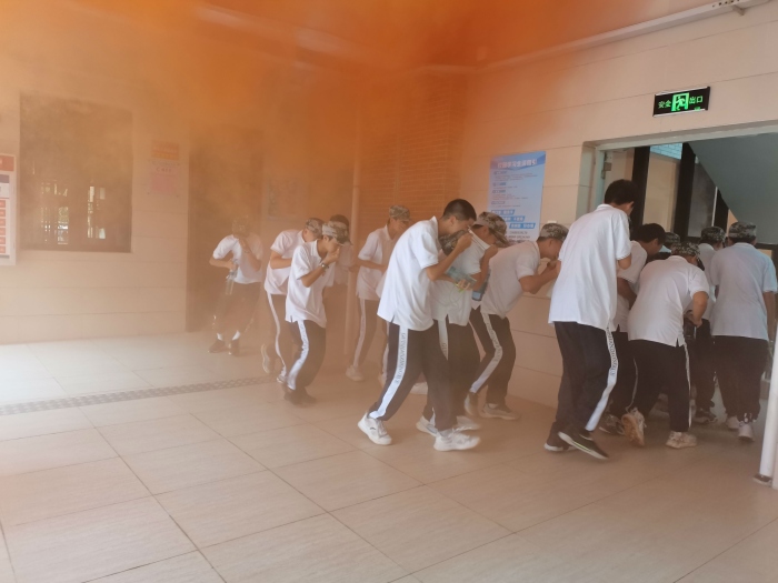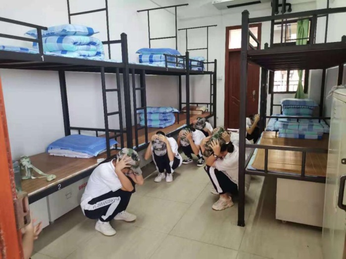 下午,宿舍地震疏散逃生演練正式開始。只聽模擬地震發(fā)生的信號——三聲短哨聲傳來,宿舍里的同學們行動迅速,立即就近躲避,用手保護著自己的頭部和頸部,背靠柜子、床架或墻角。接著,一聲長哨信號傳來,學生陸續(xù)開始疏散。各班班主任在指定位置、在恰當時機燃放早已準備好的無毒煙霧彈,為地震演習營造了更逼真的效果。守在樓梯口的老師們一邊維持秩序,一邊提醒同學們做好抱頭、彎腰、捂鼻等必要動作。同學們疏散到廣場后,各班班主任快速清點本班人數(shù)并及時報告。在整個疏散過程中,師生配合默契,組織有條不紊,人人各盡其責。