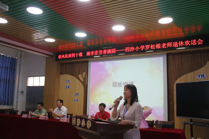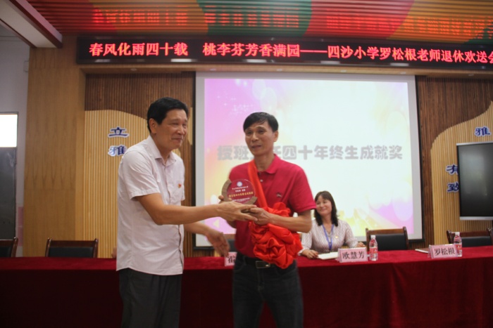 在熱烈的掌聲中,四沙小學(xué)校長歐慧芳代表學(xué)校給羅松老師贈送了紀念品,鎮(zhèn)教育和體育事務(wù)中心代表李偉業(yè)為羅松根老師獻上了鮮花,霍嘉俊主任授予羅松根老師 “班主任四十年終身成就獎”牌匾,感謝和肯定了羅松根老師為人民的教育事業(yè)作出的突出貢獻。隨后歐慧芳也代表學(xué)校作了熱情洋溢的講話,祝賀羅松根老師光榮退休,肯定了羅松根老師幾十年如一日地在本職工作崗位上默默耕耘。無論是班主任工作還是教學(xué)工作,都力爭做到最好。特別是擔(dān)任學(xué)校象棋社團的輔導(dǎo)老師12年來,羅松根經(jīng)常犧牲自己午睡時間,對學(xué)生進行象棋的輔導(dǎo)培訓(xùn)。所輔導(dǎo)學(xué)生參加鎮(zhèn)的象棋比賽已榮獲12連冠的好成績,參加市的同類比賽也名列前茅。羅老師把人生最美好的青春年華獻給了教育事業(yè),是老師們學(xué)習(xí)的楷模。歐慧芳號召全體教師向羅松根老師學(xué)習(xí),把羅松根老師無私奉獻、積極進取的精神發(fā)揚光大。希望羅松根老師科學(xué)安排晚年生活的同時,?;丶铱纯矗腋?、健康、快樂過好每一天。