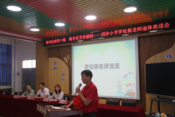 歡送會上首先播放了羅松根老師學(xué)習(xí)、工作、生活的錄像片。接著,教師代表張耀丹老師為羅松根老師佩戴大紅花,教師代表黃麗娟老師作了發(fā)言,羅松根教師也與大家一起分享了他從教42多年來教書育人的點點滴滴,感恩學(xué)校的培養(yǎng)和情同手足的同事們,充滿了感激和不舍。