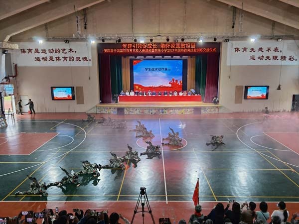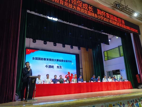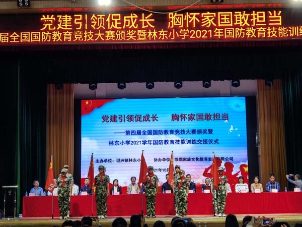 為進一步貫徹落實《中華人民共和國國防教育法》和國防特色學校相關(guān)要求,培養(yǎng)學生的國防意識,提高國防素質(zhì),深入推進學校國防特色建設(shè),10月22日,坦洲鎮(zhèn)林東小學在體育館舉行了第四屆全國國防教育競技大賽頒獎暨林東小學2021年國防教育技能訓練交接儀式。中華網(wǎng)國防軍事發(fā)展中心總經(jīng)理、大賽組委會秘書長牛淏屹,中山市委宣傳部宣傳教育科科長康維華,中山市教育和體局體衛(wèi)藝科四級主任科員李藝,中山市中小學德育研究與指導中心副主任、石岐區(qū)教體文旅局德育專干潘志堅,坦洲鎮(zhèn)宣傳辦副主任、教體文旅局副局長張穎銘,坦洲鎮(zhèn)教體文旅局副局長楊興,鎮(zhèn)武裝部干事高華順,鎮(zhèn)團委專干黃家燕,市全民國防教育講師團成員梁華,鎮(zhèn)教體中心專干、兄弟學校校長以及林東小學五、六年級全體師生和各班家委會成員參加了此次活動。