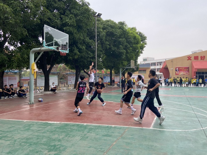 內(nèi)操場正在進行的是初中部的籃球賽,參賽隊員生龍活虎,在場上運球、急停、跳投,球進了!場上的拉拉隊立刻爆發(fā)出陣陣喝彩聲。把比賽的氣氛逐步推向高潮。