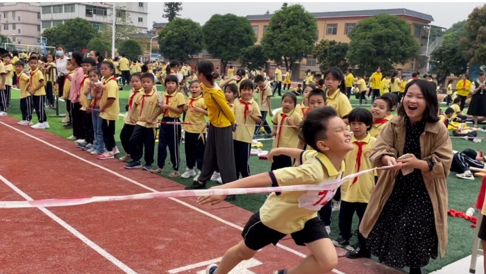 本次運動會,項目豐富,有短跑、中長跑、跳遠(yuǎn)、跳高、籃球賽等???!外操場正在舉行的是小學(xué)部的100米短跑決賽。參賽選手,彎腰蓄勢,屏息凝神?!芭椤钡囊宦暟l(fā)令槍響起,他們像離弦的箭一樣沖出起跑線,運動場上“加油!加油!”的吶喊聲,此起彼伏。有的同學(xué)還在場邊陪跑,為本班選手鼓勁。當(dāng)全部選手沖過終點時,雷鳴般的掌聲響起來,這掌聲是送給所有選手的。