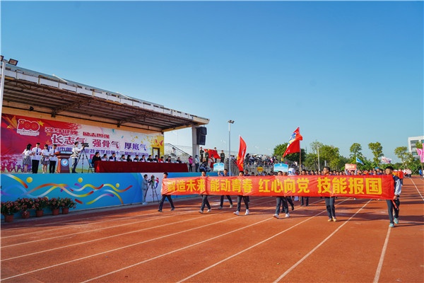 操場(chǎng)上彩旗招展,伴隨著激昂的運(yùn)動(dòng)員進(jìn)行曲,國(guó)旗護(hù)衛(wèi)隊(duì)、校旗護(hù)衛(wèi)隊(duì)、運(yùn)動(dòng)會(huì)會(huì)徽、彩旗方陣,裁判員方陣依次入場(chǎng)。由相同專業(yè)組合成的25個(gè)方陣穿上統(tǒng)一的服裝,排著整齊的隊(duì)伍,邁著矯健的步伐,英姿颯爽、神采飛揚(yáng),意氣風(fēng)發(fā)的走向主席臺(tái)接受檢閱。各方陣都在嘹亮的口號(hào)之后,結(jié)合專業(yè)建設(shè)進(jìn)行了主題鮮明、獨(dú)具匠心的才藝表演。節(jié)目形式多樣、精彩紛呈,有詩(shī)朗誦、有歌曲、有舞蹈、有情景劇、有舞獅……同學(xué)們用不同的形式展示專業(yè)技能、專業(yè)特色文化,充分體現(xiàn)了學(xué)生們的朝氣、斗志、團(tuán)結(jié)。