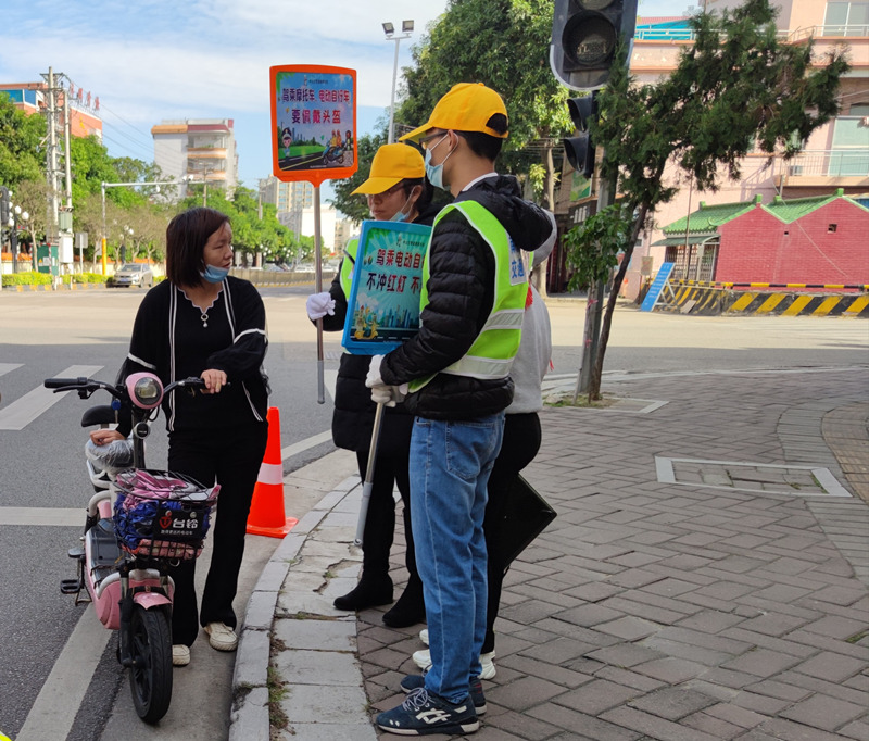 從11月起,不少市民留意到,中山市南頭鎮(zhèn)多個路口出現(xiàn)了一群醒目的身影:他們身穿熒光色志愿者馬甲,頭戴小黃帽,手舉勸導牌,勸告來來往往的摩托車、電動自行車駕乘人員遵守交通法規(guī),佩戴安全頭盔。