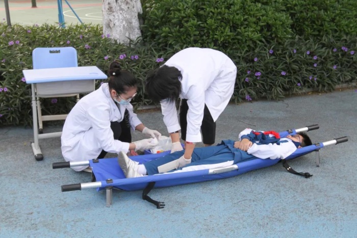 到達(dá)安全區(qū)域后,由各班班主任立刻清點(diǎn)人數(shù)層層上報(bào)。按照演練方案,行動(dòng)組發(fā)現(xiàn)一名學(xué)生“被困” 教室,指揮組組長(zhǎng)孫慧濤副校長(zhǎng)發(fā)出“請(qǐng)立即組織搜救”的指示,自救隊(duì)立即對(duì)“受傷被困”學(xué)生進(jìn)行救助。宿舍樓陽(yáng)臺(tái)“冒煙著火”(煙霧彈模擬), 1 名生活老師晃動(dòng)毛巾“呼救”,行動(dòng)組組長(zhǎng)孫慧濤副校長(zhǎng)立即做出行動(dòng)指示,指定保安人員打開消防栓進(jìn)行滅火、拉好警戒線。同時(shí),報(bào) 119 請(qǐng)求支援。消防隊(duì)員迅速響應(yīng),駕駛消防車進(jìn)入校園開展救援。同時(shí),“受傷被困”學(xué)生也被成功搜救出來(lái),到醫(yī)療救助點(diǎn)進(jìn)行包扎、檢查。