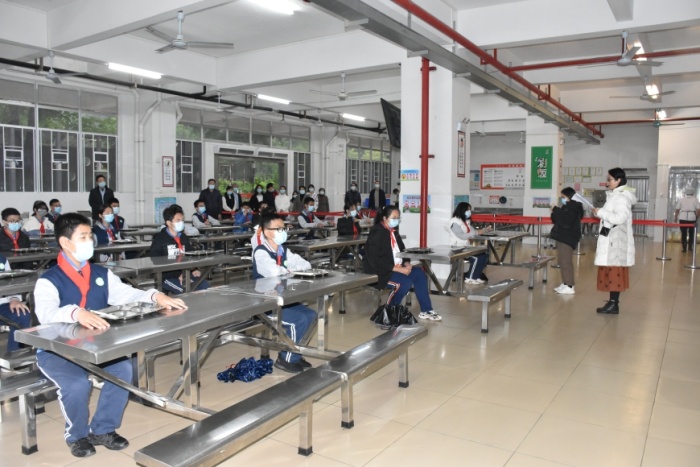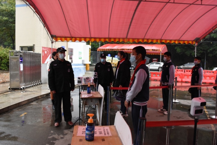 參加演練的學(xué)生首先在學(xué)校正門緩沖區(qū)排隊等待返校健康篩查,負(fù)責(zé)測溫的相關(guān)人員有序為每一位學(xué)生檢測體溫,對體溫異常的學(xué)生及時安排復(fù)查。學(xué)生順利入校后,接著進(jìn)行了教師入校、外來人員入校兩個情況的演練。隨后,參加演練的全體人員來到學(xué)生飯?zhí)眠M(jìn)行學(xué)生就餐演練,從排隊測溫、洗手、取餐、用餐到用餐完畢,每一個環(huán)節(jié)都有序而規(guī)范?!敖淌彝话l(fā)異常情況”的演練中,參加演練的師生按照預(yù)設(shè)的流程完成了對突發(fā)情況的處理,從詢問、判斷、疏散隔離、醫(yī)務(wù)人員介入、跟蹤處置到應(yīng)急預(yù)案啟動,整個過程緊張而有序。