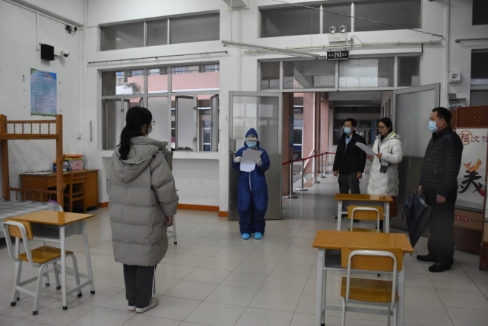 本次演練共預(yù)設(shè)了“返校入校管理”“學(xué)生就餐”“教室突發(fā)異常情況”“隔離室復(fù)查、轉(zhuǎn)運(yùn)及跟蹤處置”“學(xué)校疫情防控領(lǐng)導(dǎo)小組啟動應(yīng)急預(yù)案”等場景,通過現(xiàn)場情景演示,結(jié)合旁白解說的方式,將校園疫情防控工作的每一個關(guān)鍵節(jié)點(diǎn)形象真實地演練出來。下午4點(diǎn),2021年疫情防控應(yīng)急演練正式開始,演練按照預(yù)設(shè)流程依次進(jìn)行。其中,“返校入校管理”在學(xué)校正門口進(jìn)行,“學(xué)生就餐”在學(xué)校飯?zhí)眠M(jìn)行,“教室突發(fā)異常情況”在教室進(jìn)行,“隔離室復(fù)查、轉(zhuǎn)運(yùn)及跟蹤處置”在校醫(yī)室進(jìn)行。
