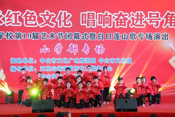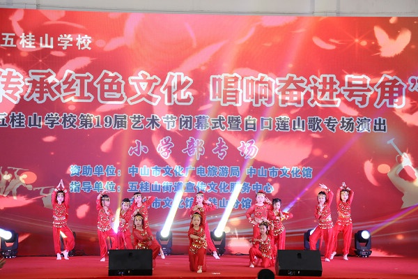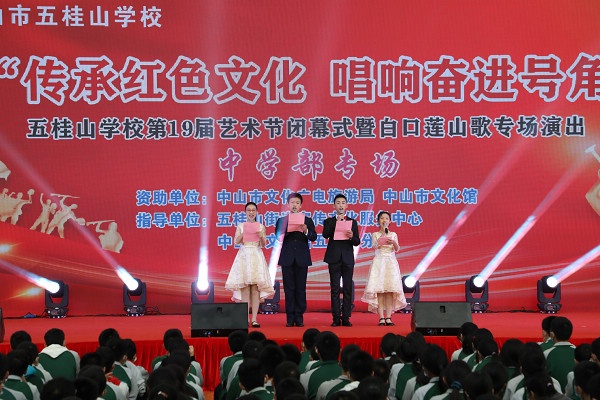 2021年12月31日一天,五桂山學(xué)校體育館內(nèi)歌舞飛揚(yáng),掌聲如潮,原來是五桂山學(xué)校在這里舉辦第19屆藝術(shù)節(jié)閉幕式暨白口蓮山歌專場(chǎng)演出。上午為小學(xué)兩個(gè)專場(chǎng),下午為中學(xué)專場(chǎng)。