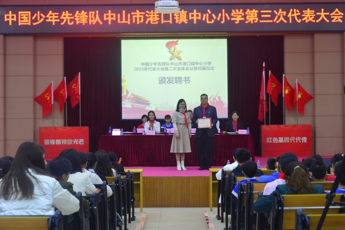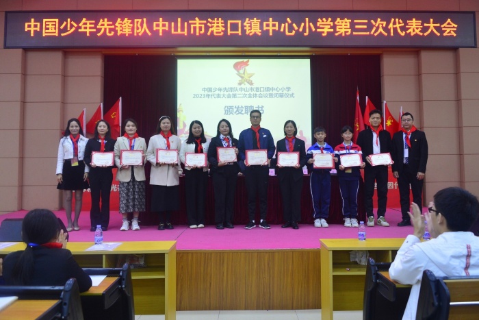 大隊委梁泉作港口鎮(zhèn)中心小學第三次代表大會籌備工作報告。少先隊大隊長五(1)中隊林浩燁向大會作少先隊工作報告。黃珈翎隊員宣讀《中國少年先鋒隊港口鎮(zhèn)中心小學第六屆大隊委候選人名單》和宣讀《中國少年先鋒隊港口鎮(zhèn)中心小學第三屆少工委委員候選人名單》并宣布港口鎮(zhèn)中心小學第六屆大隊委結果和宣布少工委三屆全委會選舉結果。隨后,大會頒發(fā)中心小學少工委正主任聘書、中心小學正、副總輔導員聘書、頒發(fā)中心小學少工委委員聘書。