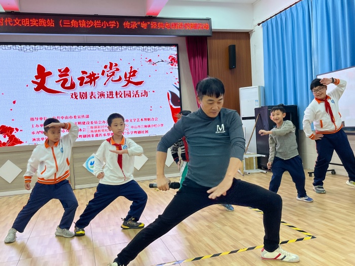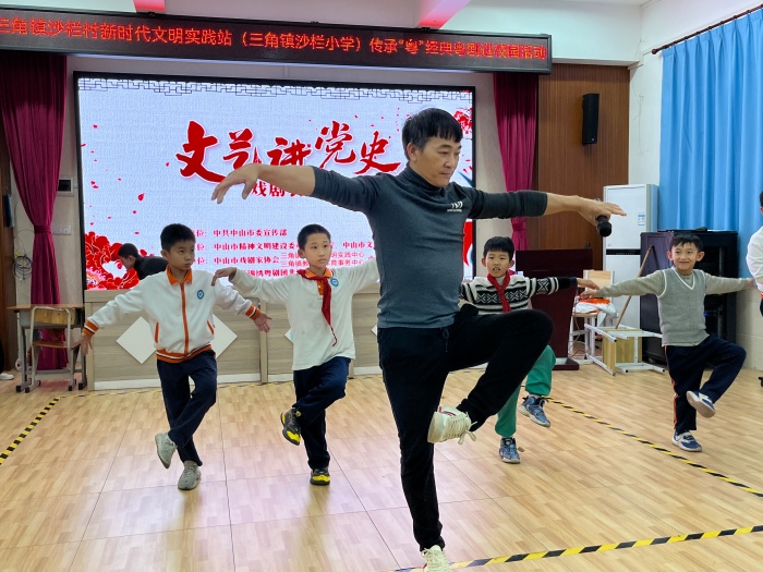 現(xiàn)場除了有精彩的講解和演繹,還有激動人心的互動環(huán)節(jié)。為了讓同學們更好地了解“四功五法”,在中山市花錦繡粵劇團老師的指導下,孩子們學習戲中人物身姿步法、眉眼神態(tài),一招一式間,感受著戲曲獨特魅力。同學們親身體驗了一把粵劇的魅力,也展現(xiàn)出沙小人的粵韻風華。
