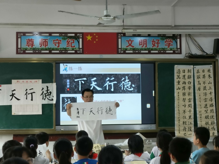 接著是馮高佳老師獻(xiàn)上四年級(jí)書法課《雙人旁》。馮老師以故事導(dǎo)入,引導(dǎo)學(xué)生仔細(xì)觀察,學(xué)生了解了雙人旁的寫法以及在結(jié)字中的運(yùn)用,通過一步步練習(xí),學(xué)生把“德”字寫得結(jié)構(gòu)勻稱、端正整潔。最后馮老師把課堂延伸到社會(huì)主義核心價(jià)值觀就是一種“德”,讓學(xué)生明白了學(xué)習(xí)書法就是修身養(yǎng)性,踐行“社會(huì)主義核心價(jià)值觀”。由于條件有限,高厝寮小學(xué)的學(xué)生基本都是第一次接觸書法,但短短的一節(jié)課下來,學(xué)生的作品完成度出乎意料,贏得了在場所有老師的贊美。馮老師的這節(jié)書法課對學(xué)生來說既是甘霖雨露,更是學(xué)習(xí)書法路上的一顆啟蒙種子!