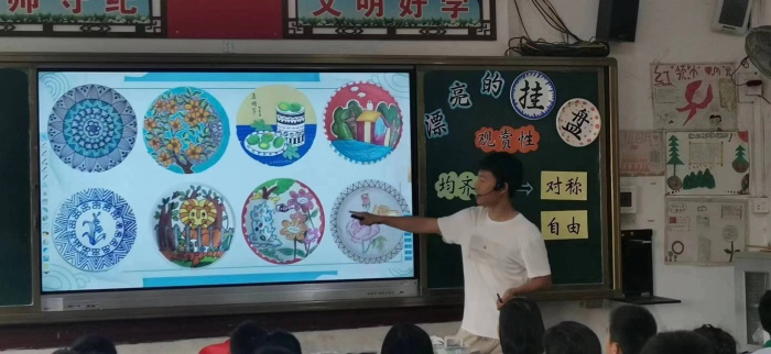 首先是李孟陽老師的美術(shù)課《漂亮的掛盤》。盤子是學(xué)生們常用的盛菜工具,而藝術(shù)掛盤卻是農(nóng)村孩子不常見的工藝品,為了讓學(xué)生感受美術(shù)與生活的關(guān)系,李老師精心設(shè)計(jì)了本節(jié)課,通過視頻和圖片讓學(xué)生了解掛盤,感受其均齊式的韻律之美與平衡式的輕松自由之美,經(jīng)過李老師細(xì)致地講解和投影畫畫示范,同學(xué)們開始創(chuàng)作。二十分鐘后,一幅幅精美而不重樣的掛盤作品浮現(xiàn)在眼前,李老師給予學(xué)生極大的肯定。一節(jié)課下來,學(xué)生學(xué)會(huì)了運(yùn)用適合裝飾紋樣裝飾掛盤,也提高了欣賞美與創(chuàng)造美的能力。
