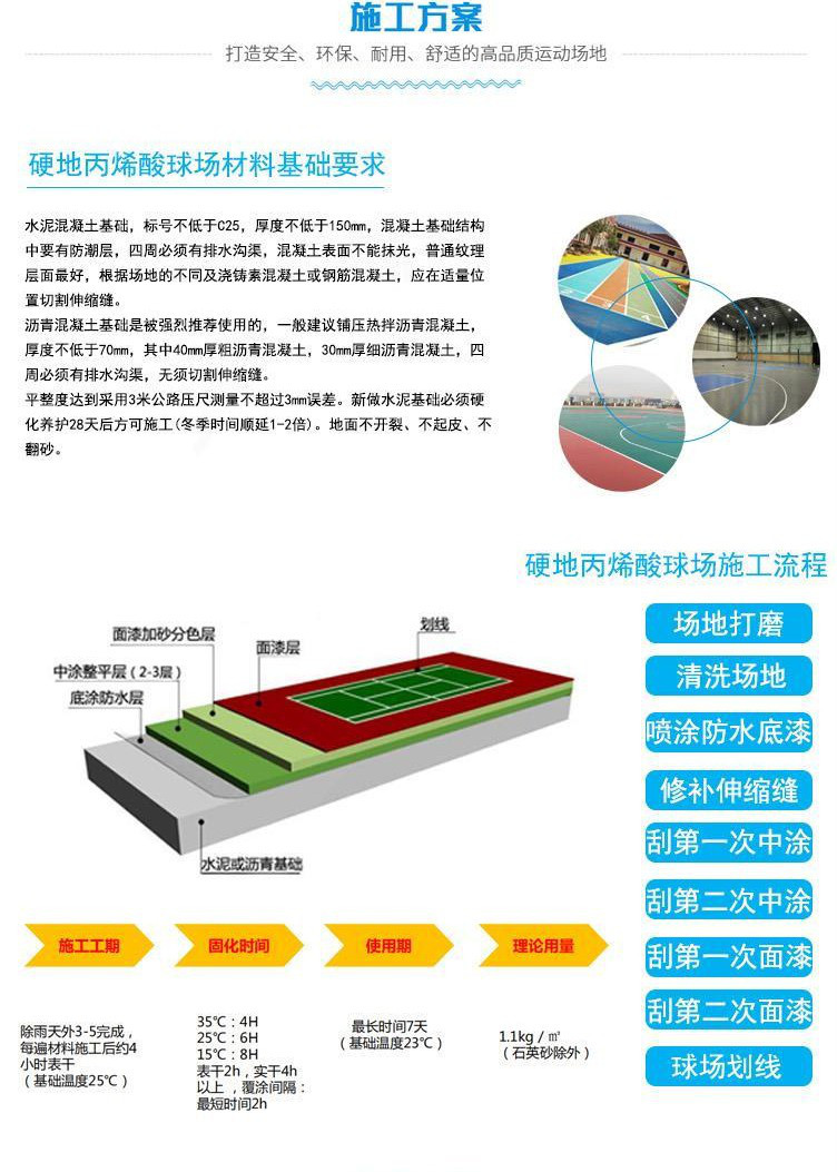 適用范圍:網(wǎng)球場(chǎng)、籃球場(chǎng)、羽毛球場(chǎng)、排球場(chǎng)、室內(nèi)外地坪,走廊樓梯,景觀道路,游樂(lè)場(chǎng)地面。