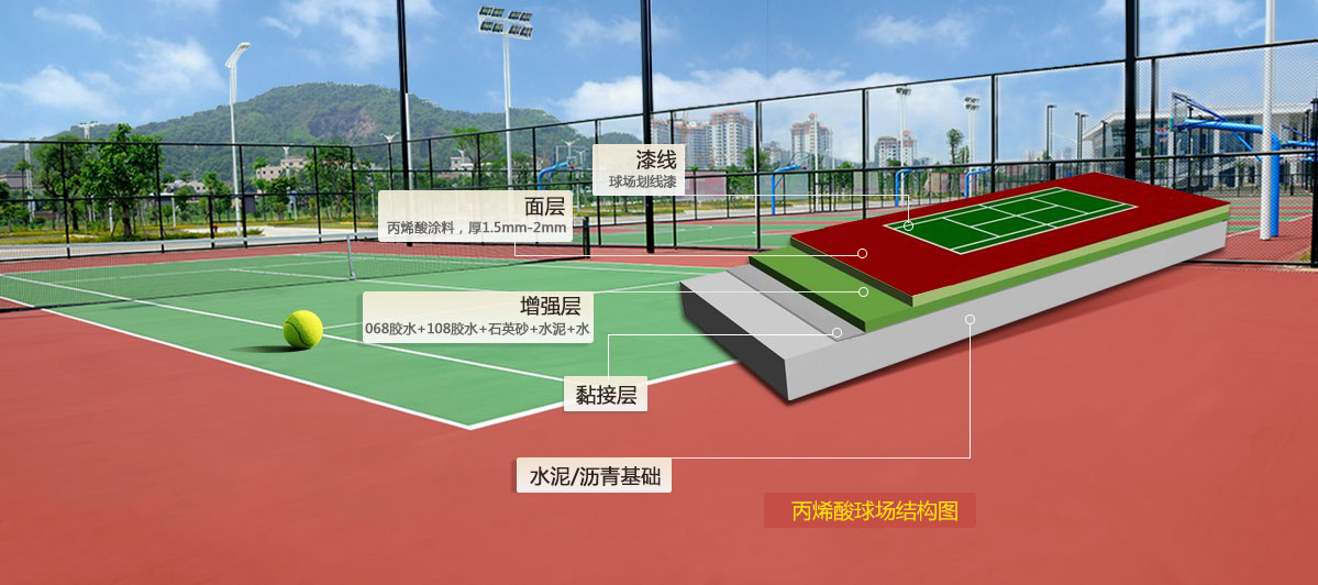 面層:由色彩鮮艷、抗紫外光的丙烯酸涂料鋪成增加耐磨性。