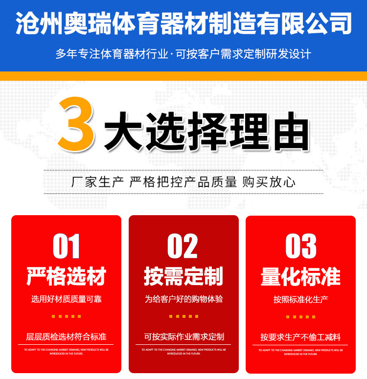 ,滄州奧瑞體育器材制造有限公司擁有一批素質(zhì)高的管理人才,配備了成套的先進(jìn)設(shè)備,建立了科學(xué)的生產(chǎn)