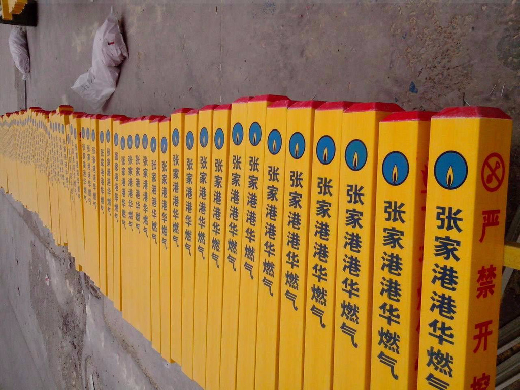 玻璃鋼(PVC)標(biāo)志樁安裝底部設(shè)有兩對穿孔,0.5直徑小斷鋼筋呈十字交叉,灌少量水泥固定;安裝步驟:1.挖30-50cm深度30-60cm方洞2.將兩段鋼筋插入標(biāo)志樁下方對稱插孔中呈對稱十字交叉3.放入標(biāo)志樁;燃氣管道警示牌的用途玻璃鋼標(biāo)志牌常用于高風(fēng)險地區(qū)管道安全防范事項的地面警示標(biāo)志,例如隧道、大型河流、山谷、沖溝、村莊等。用于標(biāo)記埋地管道的轉(zhuǎn)向、管道與地面工程(地下隱蔽物)交叉、管理單位交界、管道結(jié)構(gòu)變化(管徑、壁厚、防護層)、管道附屬設(shè)施的地面標(biāo)記。常見為鬧市、風(fēng)景區(qū)、綠化帶、灌木叢、頂管兩側(cè)管線路徑指示作用。輸油管道標(biāo)示牌又叫輸氣管道標(biāo)示牌、電力電纜標(biāo)示牌、礦區(qū)指示標(biāo)示牌、交通警示標(biāo)示牌、戶外指示牌等。燃氣管道標(biāo)志牌(管道s環(huán))三要素1、識別s,2、介質(zhì)名稱,3、流向所有管道標(biāo)識都必須注明識別s、介質(zhì)名稱和流向,這j是管道標(biāo)識的基本三要素。有些管道還須注明壓力、流速、溫度等,危險化學(xué)品管道需要用專用危化品s環(huán),消防管道還要注明消防專用等。