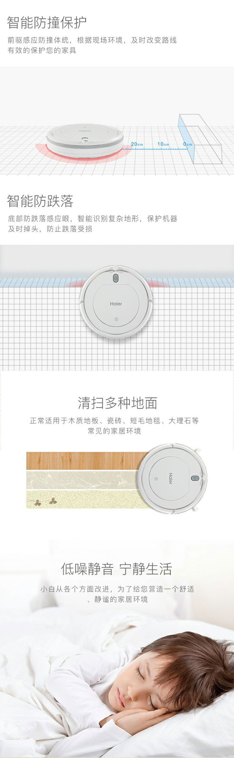 這款機(jī)器噪音非常的小,享受寧靜干凈的生活。能根據(jù)環(huán)境自成路徑,靠墻打掃,沒有死角可言。底部還有防跌落的感應(yīng)眼睛,智能識別復(fù)雜的地形,保護(hù)機(jī)器及時(shí)調(diào)頭,防止跌落受損。前驅(qū)感應(yīng)防撞體統(tǒng),根據(jù)現(xiàn)場的環(huán)境能夠及時(shí)的改變路線,有效地保護(hù)您的家具和機(jī)器本身。機(jī)身厚度僅7.2cm,解決了機(jī)身被門檻、家具卡住的問題,適用于木質(zhì)地板、瓷磚、短毛地毯、大理石等等常見的家居環(huán)境。海爾專注研發(fā)家電多年,值得信賴。