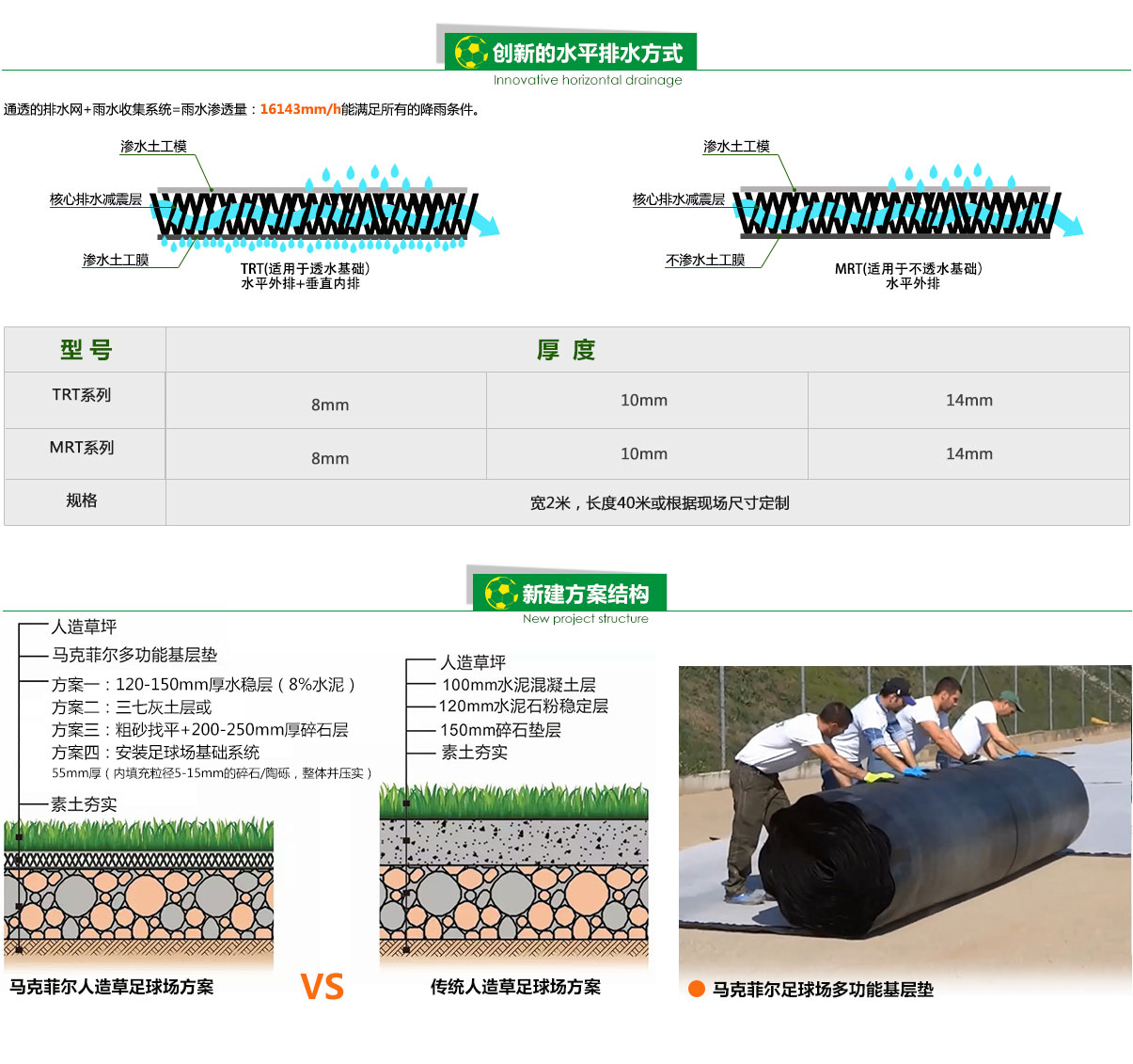馬克菲爾足球場(chǎng)多功能基層墊是一款專用于人造草足球場(chǎng)的基礎(chǔ)墊層,以其卓越的性能和創(chuàng)新的系統(tǒng)設(shè)計(jì)滿足最高端的場(chǎng)地要求。是一款徹底顛覆傳統(tǒng)足球場(chǎng)基礎(chǔ)建造方案的革命性產(chǎn)品。其多功能表現(xiàn)為:可替代水泥和瀝青基礎(chǔ),高效緩沖減震以及卓越的排水能力和球場(chǎng)穩(wěn)定性。
