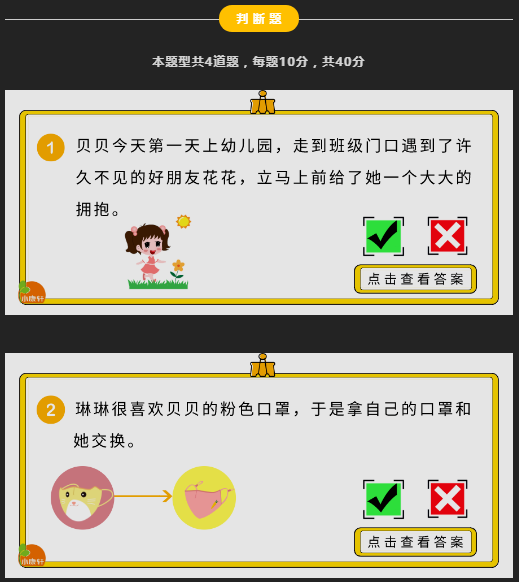 那么,你們的幼兒園開學(xué)了嗎?你們班的孩子安全系數(shù)又是多少?這份幼兒園致所有小朋友們疫情防護(hù)測試題,幼師們快發(fā)到家長群,請家長監(jiān)督完成,看看你們班的孩子適不適合開學(xué)呢?
