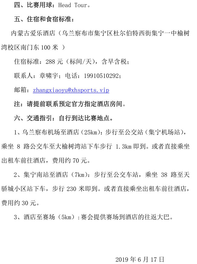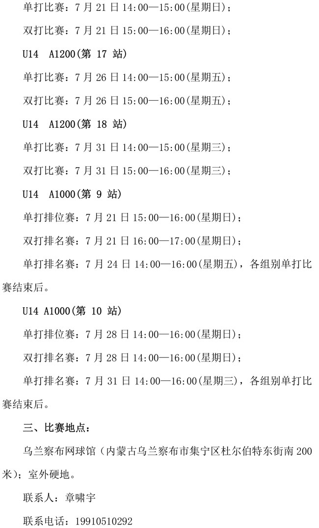 2019年全國青少年網球積分排名系列賽(烏蘭察布站)補充通知