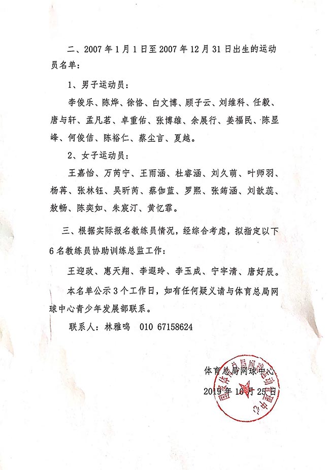 關(guān)于獲得2020年度國家少年網(wǎng)球隊(duì)運(yùn)動(dòng)員選拔提名資格名單的公示