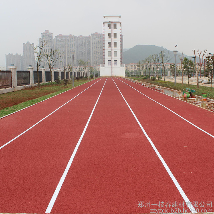 4、混合型塑膠跑道是PU與黑色橡膠顆粒按一定比例混合而成跑道系統(tǒng)。材料運到現(xiàn)場按一定比例混合,加入催化劑攪拌均勻,攤鋪,常溫硫化成型,該面層是現(xiàn)時有標準的塑膠面層材料,主要用于專業(yè)比賽用場地等。