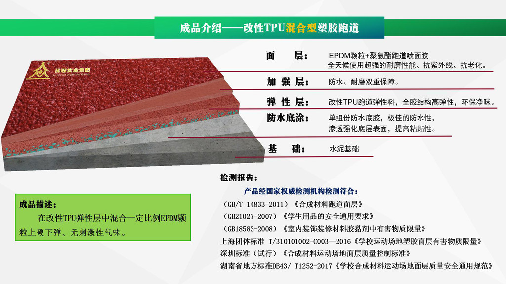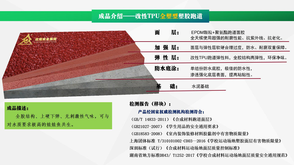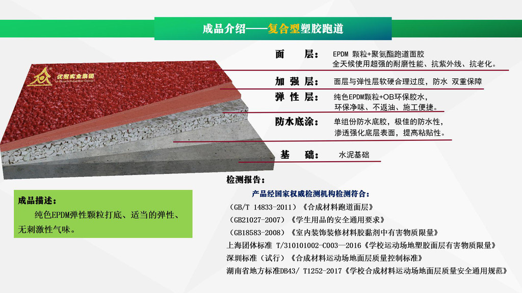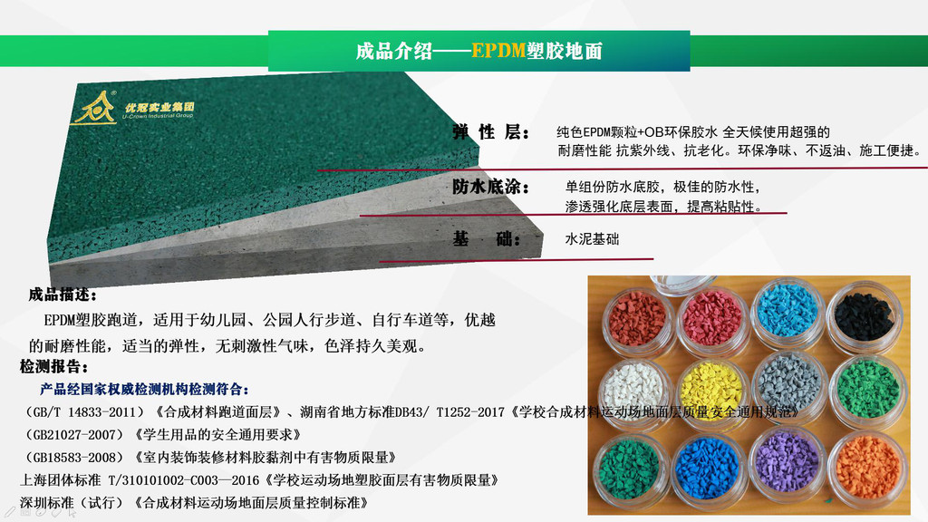 優(yōu)冠實(shí)業(yè)集團(tuán)有限公司(以下簡稱集團(tuán))是一家專業(yè)從事運(yùn)動場地材料,人造草坪研發(fā)、生產(chǎn)、銷售、鋪裝的科技創(chuàng)新型企業(yè),是湖南省地方標(biāo)準(zhǔn)DB43/ T1252-2017《學(xué)校合成材料運(yùn)動場地面層質(zhì)量安全通用規(guī)范》主要起草單位之一。公司具備國際田聯(lián)(IAAF)認(rèn)證、國際網(wǎng)聯(lián)(ITF)認(rèn)證、中國環(huán)境標(biāo)志產(chǎn)品認(rèn)證、中國綠色材料標(biāo)志授權(quán)使用證書、企業(yè)生產(chǎn)環(huán)評批復(fù)報(bào)告、安全生產(chǎn)標(biāo)準(zhǔn)化三級企業(yè)證書、對外貿(mào)易經(jīng)營者備案登記表等,并成為湖南省政府采購協(xié)會會員。集團(tuán)下轄湖南優(yōu)冠體育材料有限公司、五舟體育設(shè)備制造有限公司、湖南康普斯人造草坪有限公司、湖南科迪環(huán)??萍加邢薰?、湖南優(yōu)冠運(yùn)動場鋪裝技術(shù)服務(wù)有限公司、湖南優(yōu)冠塑膠體育工程有限公司。