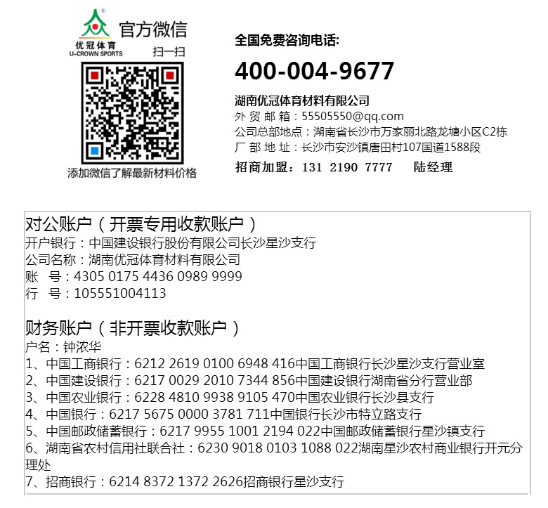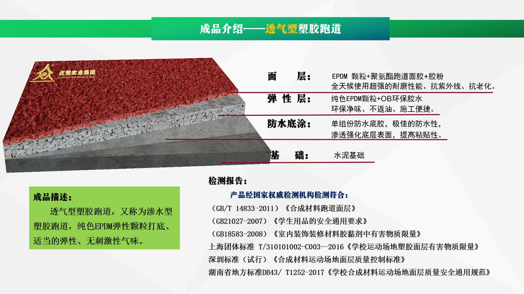 優(yōu)冠實(shí)業(yè)集團(tuán)有限公司(以下簡(jiǎn)稱集團(tuán))是一家專業(yè)從事運(yùn)動(dòng)場(chǎng)地材料,人造草坪研發(fā)、生產(chǎn)、銷售、鋪裝的科技創(chuàng)新型企業(yè),是湖南省地方標(biāo)準(zhǔn)DB43/ T1252-2017《學(xué)校合成材料運(yùn)動(dòng)場(chǎng)地面層質(zhì)量安全通用規(guī)范》主要起草單位之一。公司具備國(guó)際田聯(lián)(IAAF)認(rèn)證、國(guó)際網(wǎng)聯(lián)(ITF)認(rèn)證、中國(guó)環(huán)境標(biāo)志產(chǎn)品認(rèn)證、中國(guó)綠色材料標(biāo)志授權(quán)使用證書、企業(yè)生產(chǎn)環(huán)評(píng)批復(fù)報(bào)告、安全生產(chǎn)標(biāo)準(zhǔn)化三級(jí)企業(yè)證書、對(duì)外貿(mào)易經(jīng)營(yíng)者備案登記表等,并成為湖南省政府采購協(xié)會(huì)會(huì)員。集團(tuán)下轄湖南優(yōu)冠體育材料有限公司、五舟體育設(shè)備制造有限公司、湖南康普斯人造草坪有限公司、湖南科迪環(huán)??萍加邢薰尽⒑蟽?yōu)冠運(yùn)動(dòng)場(chǎng)鋪裝技術(shù)服務(wù)有限公司、湖南優(yōu)冠塑膠體育工程有限公司。