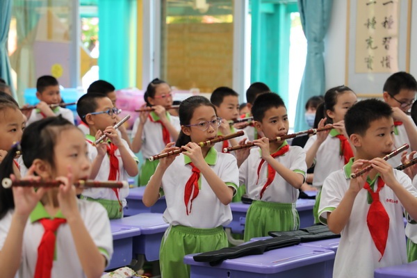 清晨的校園里隨處可見忙碌的身影,竹笛社團的孩子們在學(xué)校西門吹奏《青花瓷》《我愛你中國》《童年》等曲目,用優(yōu)美旋律迎接各方來賓;南門名人園里,在鐘遠(yuǎn)良老師的電子琴伴奏下,六2班袁鴻林、六5班劉馨瑜等幾位優(yōu)秀竹笛學(xué)生代表輪番演奏《牧民新歌》《姑蘇行》等經(jīng)典曲目;東門童趣園里,六6班全體學(xué)生吹響《每當(dāng)我走過老師窗前》《紅星歌》等耳熟能詳?shù)母枨?/p>