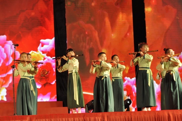 晚上7點30分,學(xué)校運動場燈光流轉(zhuǎn), “綻放”十周年校慶文藝晚會準(zhǔn)時開幕。開發(fā)區(qū)文體教育局局長趙云清、中山市教育招生考試中心副主任周勇、開發(fā)區(qū)教育事務(wù)指導(dǎo)中心主任鐘海清、副主任關(guān)影紅及區(qū)內(nèi)各學(xué)校領(lǐng)導(dǎo)出席。本次晚會分為蓄力飛翔、感動十載、筑夢未來三個篇章,共13個節(jié)目。首先,在呂曉寧老師的指揮下,全體學(xué)生整齊起立,二至六年級共1800多名學(xué)生用手中的竹笛奏響《歡迎曲》,一年級的學(xué)生則用雙手打起節(jié)奏,現(xiàn)場千人合奏場面震撼,彰顯香暉園小學(xué)全面普及竹笛教育的成果。本場晚會,葉建林老師的竹笛獨奏《春到湘江》、呂曉寧老師指導(dǎo)的民樂合奏《金蛇狂舞》、竹笛合奏《揚鞭催馬運糧忙》以及余夢園老師指導(dǎo)的竹笛二重奏《跑旱船》等精彩的竹笛節(jié)目更是將小小竹笛的魅力呈現(xiàn)得淋漓盡致。此外,故事講演、情景劇、合唱、創(chuàng)意服裝秀等豐富多樣的節(jié)目更是精彩紛呈,現(xiàn)場氣氛熱烈。