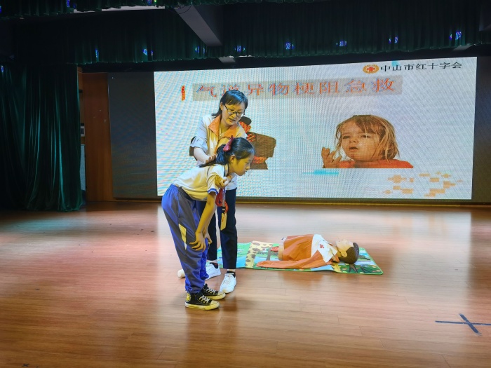 講座中,鄭老師語言生動易懂,配合詳細的PPT展示、問答互動和現(xiàn)場的模仿操作,現(xiàn)場氣氛十分活躍,學生們積極參與其中。她尤其重點講解了在實際救援中,如何抓住最有效的“黃金四分鐘”時間,開展心肺復(fù)蘇救援。鄭老師為了讓模擬更加逼真,她結(jié)合模型,親身給學生示范如何正確進行心肺復(fù)蘇,告訴孩子們心肺復(fù)蘇的正確按壓部位和步驟,并邀請了學生上臺模擬。同學們興趣盎然,部分學生還上臺進行了互動交流,贏得現(xiàn)場掌聲陣陣。講座的最后,鄭老師呼吁同學們重視生命安全,學會科學施救。會后中山市紅十字會還為同學們分發(fā)了紅十字會宣傳手冊。