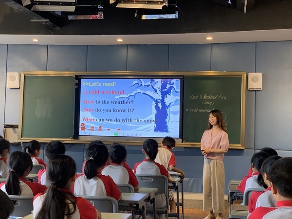 首先,博凱小學(xué)的游彩霞老師圍繞課題上了一節(jié)故事示范課。游老師執(zhí)教的是四年級下學(xué)期《Weekend Fun》story部分。游老師以節(jié)奏歡快的英語歌曲熱場,地道的英語發(fā)音,極強的表現(xiàn)力和感染力,讓課堂充滿了激情和活力。學(xué)生在輕松愉快的氛圍中發(fā)展了語言和思維,在情景中體驗著學(xué)習(xí)英語的快樂。游老師根據(jù)故事內(nèi)容,以圖片環(huán)游的方式幫助學(xué)生去理解故事內(nèi)容。通過創(chuàng)設(shè)情境,引導(dǎo)學(xué)生觀察圖片,并根據(jù)故事文本設(shè)置了不同的問題,由簡入難層層深入故事學(xué)習(xí)。課堂教學(xué)環(huán)節(jié)科學(xué)有效,很好的實現(xiàn)了教學(xué)目標(biāo)。游老師通過手繪圖片搭建思維導(dǎo)圖,生動新穎的板書極大程度上吸引學(xué)生的學(xué)習(xí)興趣。完成故事文本教學(xué)后,游老師注重引導(dǎo)學(xué)生根據(jù)思維導(dǎo)圖進(jìn)行復(fù)述。孩子們認(rèn)真思考,積極參與復(fù)述環(huán)節(jié)。大部分孩子表現(xiàn)得自信大方,能正確運用思維導(dǎo)圖上的關(guān)鍵詞進(jìn)行故事復(fù)述,所表達(dá)的信息準(zhǔn)確且完整。孩子們流暢、生動的復(fù)述將本節(jié)課的故事教學(xué)推向了高潮。游老師及時對孩子們的復(fù)述情況進(jìn)行適當(dāng)評價,效果良好。