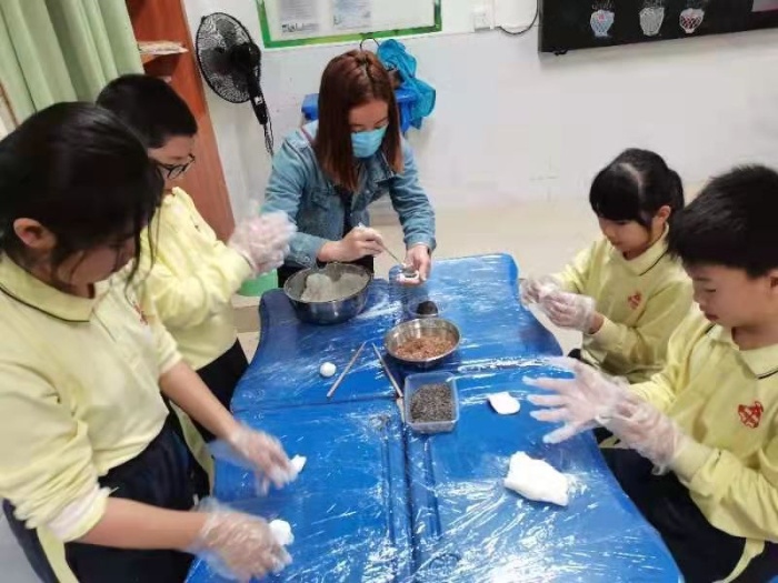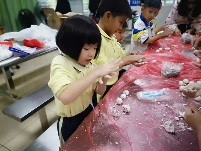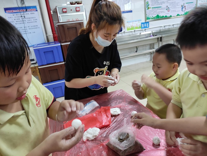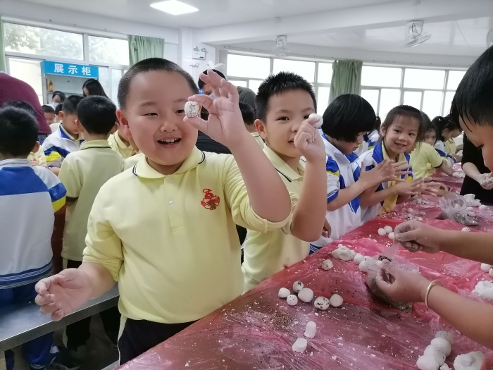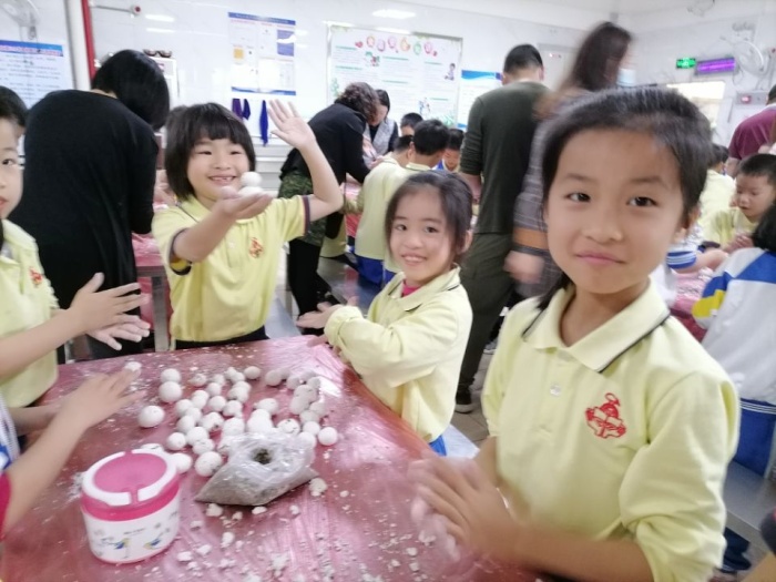 首先,孩子們洗干凈雙手,挽起衣袖,有模有樣的學(xué)著爸爸媽媽的樣子包起湯圓:先拿和好的糯米粉團(tuán)揪一小團(tuán),糯米面,讓孩子們擠壓成圓片形狀,再挑一團(tuán)餡放在糯米片上,最后用雙手轉(zhuǎn)邊收口做成一個(gè)小圓球??粗粋€(gè)個(gè)圓溜溜的湯圓真可愛(ài)!緊接著,煮湯圓時(shí),先燒開(kāi)水,把湯圓慢慢放入鍋內(nèi),輕輕的攪開(kāi),湯圓浮出水面代表已經(jīng)煮熟。活動(dòng)最后,家長(zhǎng)伴著《賣湯圓》的優(yōu)美旋律和孩子們一起品嘗著自己的勞動(dòng)成果,每個(gè)人的臉上都洋溢著過(guò)節(jié)的喜慶。