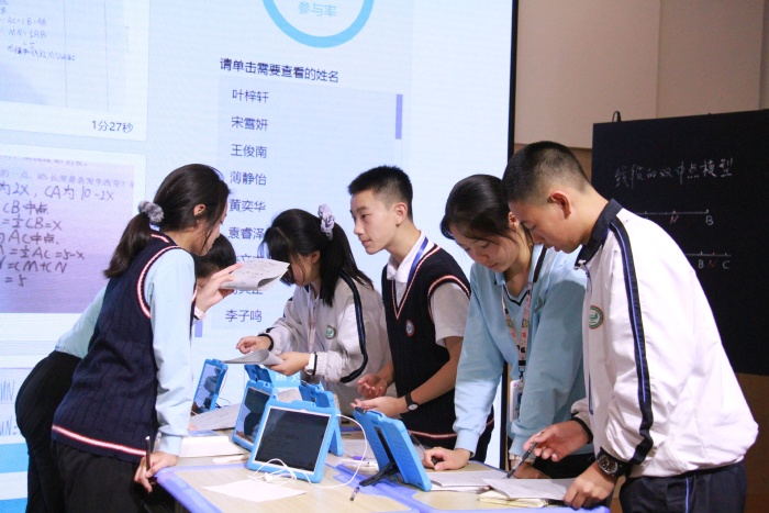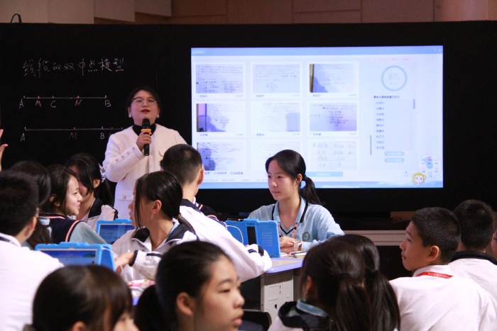 大家移步到一樓報告廳時,今天一襲白衣,顯得格外溫柔的陳盼老師帶著八班的同學們已經(jīng)整齊坐好。陳盼老師組織同學們先用洋蔥學院進行了課前預習,通過智慧平板在課前進行作業(yè)訂正和組內(nèi)答疑,讓學生對雙中點模型有了初步的印象。課中,使用Geogebra(動態(tài)幾何畫板)進行展示,幫助學生了解雙中點模型。陳老師特別注重小組合作,簡單的題或知識點采用小組合作采用對學的模式,難度較高的則采用群學的模式,充分發(fā)揮小組的力量。同時使用智慧教育平臺,學生通過平板拍照上傳小組探討結果,老師及時收集數(shù)據(jù)、反饋答題結果,據(jù)此組織教學重點。班上的小小老師,上臺展示時,講解清晰,絲毫不怯場,也讓人眼前一亮!數(shù)學課其實也可以有很多互動,陳老師與八班的孩子們優(yōu)秀地展示了紀雅的教學特色:基于智慧教育初中課堂小組合作學習”的教育教學模式。