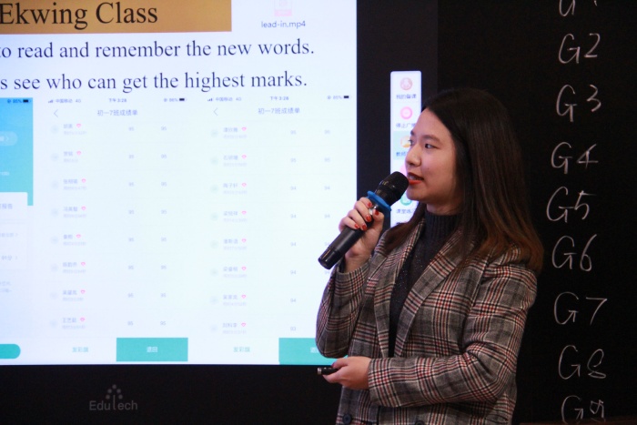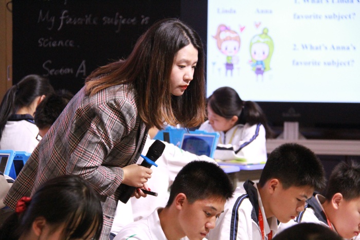 首先初一(7)班同學們齊聲面對大家先說了自己班級口號。下面的課程中,就不再聽到大家說中文了,真正做到英語課就從一始終用英文來交流。在課前的預習任務中,黎老師使用翼課網(wǎng)布置讀記單詞任務,看誰識記最快。(所有上課任務都是實行加分的)上課開始,黎老師展示了學習目標。而這堂課的內(nèi)容是:我最喜歡的學科和老師,所以先展示了同學們熟悉的各任課老師說英語的視頻,并用任課老師生活照片來提示大家用英文說科目名稱,讓學生一下就能融入學習任務與環(huán)境中。課中使用智慧課堂平臺發(fā)送(聽力)練習或發(fā)送做題任務,學生拍照上傳答案,及時反饋做題結果,提高了課堂練習的效率。黎老師同樣十分注重小組合作,給學生創(chuàng)造語境,讓學生小組交流,兩人對話展示,說說自己最喜歡的科目與老師,以及理由??匆曨l,了解班上其它同學喜歡哪一位老師與科目。接著以小組合作的形式進行語言輸出,互相交流做調查,并選擇代表展示全組交流結果。不僅達到了本節(jié)課教育目標,同樣體現(xiàn)了學校特色,為英語課堂的技術融合提供了經(jīng)驗。7班、8班的孩子們在退場時,都能做到安靜、有序、有禮貌,體現(xiàn)了紀雅學子的素養(yǎng)。