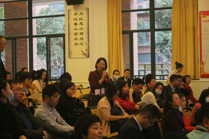 觀摩課結束,參會人員集中研討交流,汪和生副院長主持建議來自不同區(qū)的老師能自由點評一下。來自東莞、中山其他試點校的老師在肯定紀雅取得優(yōu)秀成果基礎上提出幾點疑惑,如小組合作學習的任務安排與效果評價,小組文化建設、班級文化建設中的德育與教學目標怎么劃分,英語課如何用信息技術體現(xiàn)學生的思維。這些疑惑,王校長自信從容,結合紀雅的操作經(jīng)驗、現(xiàn)實做法,輕松地一一作了回答。