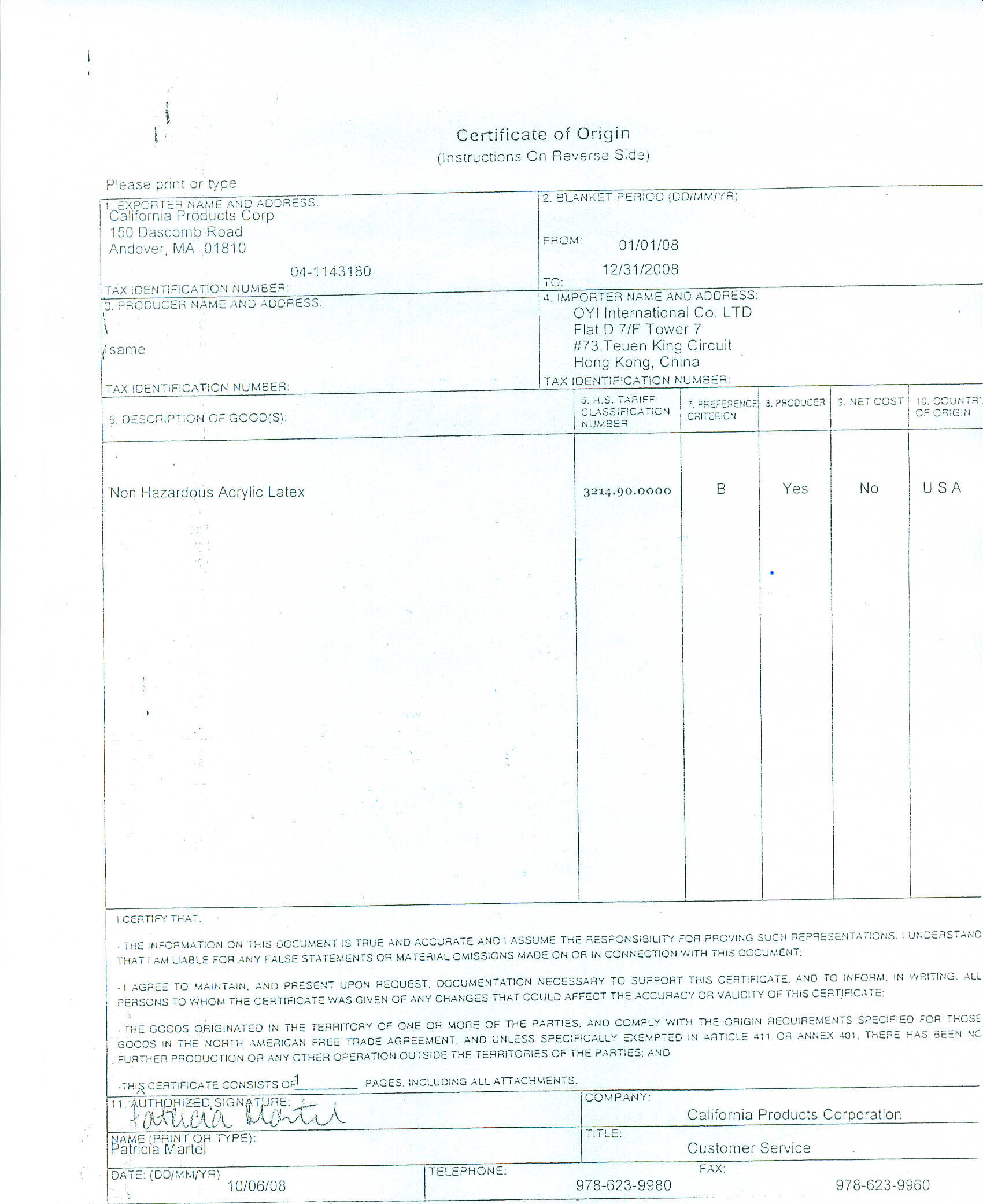 美國Plexipave原產(chǎn)地證書