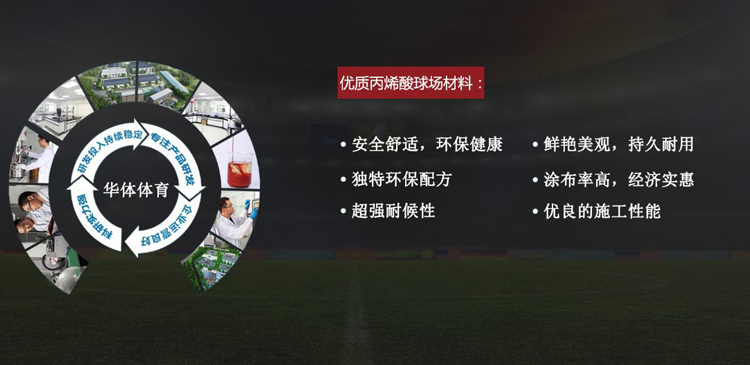 丙烯酸底中面全面升級,由華體花重金請知名高級化工教授劉信教授歷時3個月研究,于2015-3-18問世。現(xiàn)已全面代替?zhèn)鹘y(tǒng)丙烯酸。使丙烯酸球場耐磨度提高30%,顏色細膩度提升25%,使用年限多2年。