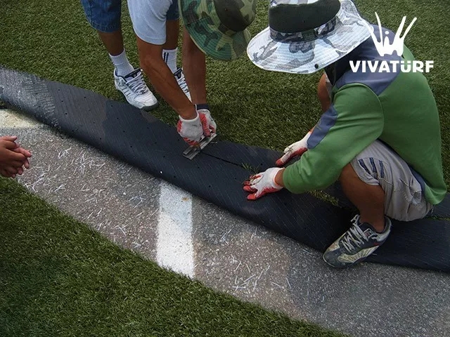 利用專用涂膠工具在人造草坪背面涂膠,涂膠厚度要一樣,不能出現(xiàn)高低現(xiàn)象;涂膠速度要均勻,不能反復(fù)涂膠;在涂膠干燥完成后,進行粘合人造草坪粘合完工后,利用專用加壓工具,使人造草坪密實度緊實;之后,進行人造草坪清理,人造草坪固化利用三天時間對人造草坪進行檢查和修整。